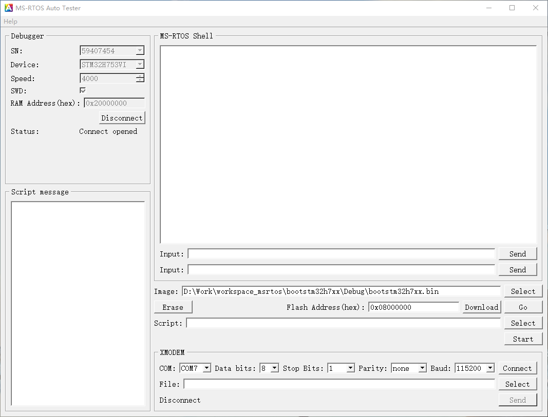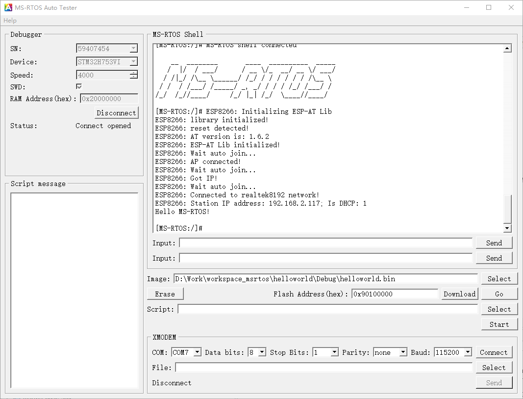 编译完成后,可以使用 MS-RTOS Auto Tester 工具烧录生成的 demo 镜像到 FLASH 0x90100000 地址处,点击 Go 按钮或对 IoT Pi Pro 进行复位,IoT Pi Pro 的 CPU 将开始运行,MS-RTOS 启动后,会自动运行 FLASH 0x90100000 地址处的 demo 应用程序。