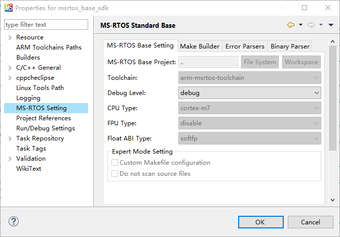 待下载完毕后,选中 msrtos_base_sdk 工程,点击鼠标右键,点击弹出的快捷菜单中的 Poperties 菜单项,将弹出 msrtos_base_sdk 工程属性配置对话框,选择 MS-RTOS Setting 类,将 Debug Level 修改为 debug,最后点击 OK 按钮: