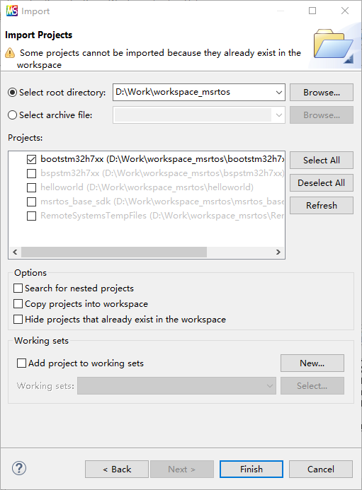 下载完毕后,回到 IoT Studio 里,点击 File > Import... 菜单项,打开工程导入对话框,选择 MS-RTOS Projects 工程类型, 勾选 bootstm32h7xx 工程,点击 Finish 按钮完成导入:
