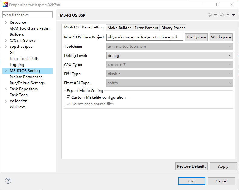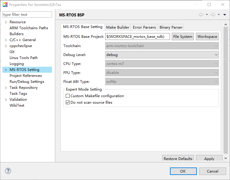 选中 bspstm32h7xx 工程,点击鼠标右键,点击弹出的快捷菜单中的 Poperties 菜单项,将弹出 bspstm32h7xx 工程属性配置对话框,选择 MS-RTOS Setting 类,选择 workspace 的 msrtos_base_sdk 工程作为 bspstm32h7xx 工程的 MS-RTOS Base Project,Debug Level 选择 debug,最后点击 OK 按钮: