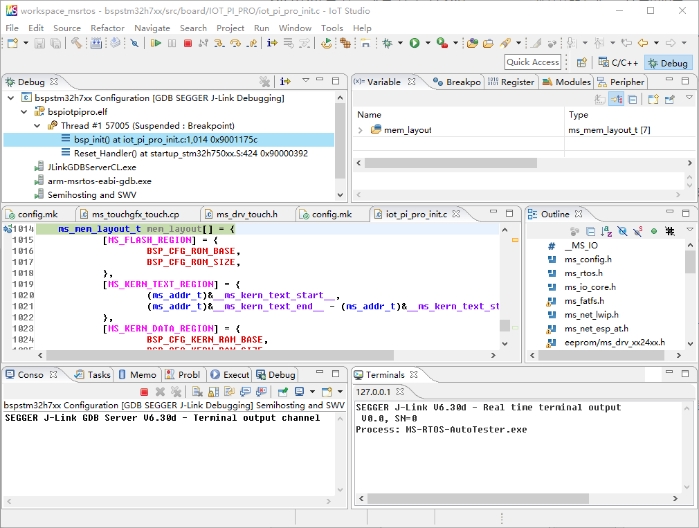 当 BSP 镜像下载完毕后,会在 bsp_init 函数停下。IoT Studio 内建的 Terminal 终端将会自动连接到 MS-RTOS 的 shell,接下来就可以正式开始调试。