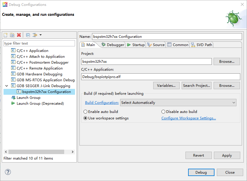 - 点击 C/C++ Application 右侧的 Browse... 按钮选择需要调试的 ELF 文件,如 Debug/bspiotpipro.elf。