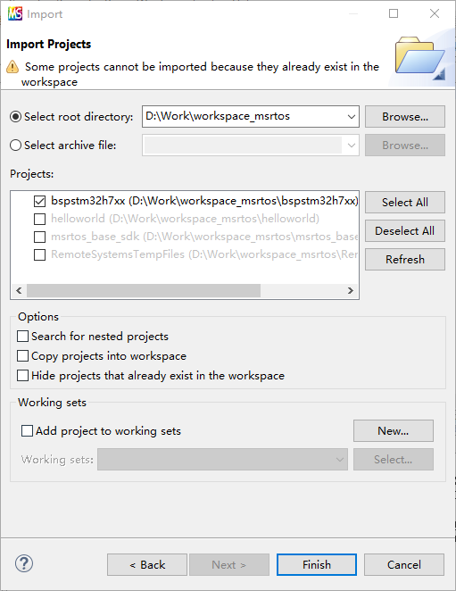 下载完毕后,回到 IoT Studio 里,点击 File > Import... 菜单项,打开工程导入对话框,选择 MS-RTOS Projects 工程类型, 勾选 bspstm32h7xx 工程,点击 Finish 按钮完成导入: