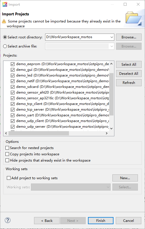 下载完毕后,回到 IoT Studio 里,点击 File > Import... 菜单项,打开工程导入对话框,选择 MS-RTOS Projects 工程类型, 勾选所有 demo 工程,点击 Finish 按钮完成导入: