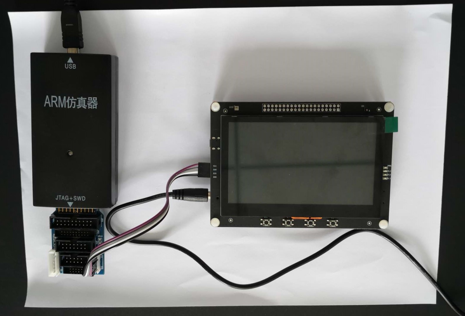 配件包括:四个塑料铜柱、一个两排 20PIN 的插针、一根 Micro USB 线、一根 USB 电源线、一根硬件调试器 SWD 接口 的 4PIN 连接线(其中黑线为 GND)。