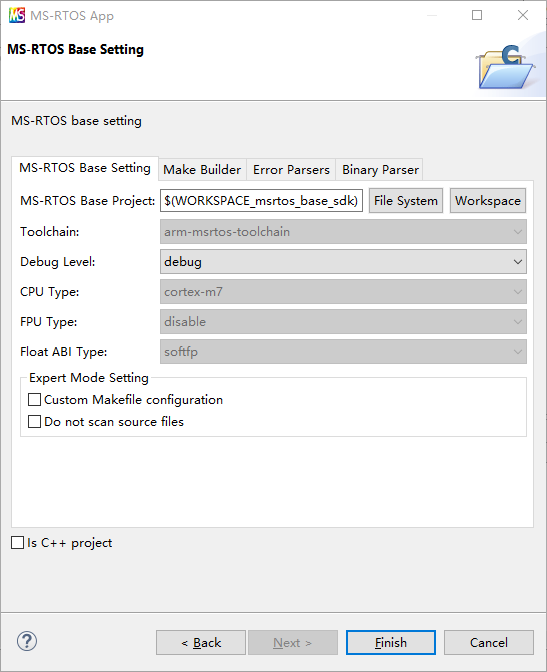 点击 Next 按钮,选择 msrtos_base_sdk 工程作为 helloworld 工程的 MS-RTOS Base Project,Debug Level 选择 debug,最后点击 Finish 按钮: